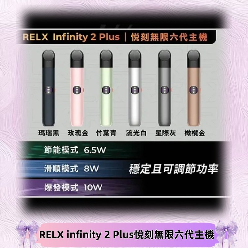 RELX六代主機,也稱為RELX Infinity,是悅刻品牌推出的一款高端電子煙設備,旨在提供卓越的使用體驗。時尚簡約的設計,機身採用高品質的鋁合金材質,手感舒適且堅固耐用。支持無線充電和快速充電,充電更便捷。使用Type-C介面進行快速充電,充電速度更快。搭載最新的FEELM陶瓷霧化技術,提供穩定且豐富的煙霧量和更純淨的口感。RELX Infinity以其優雅的設計、高效的霧化技術和便捷的使用體驗,成為電子煙市場中的佼佼者,深受用戶喜愛。
