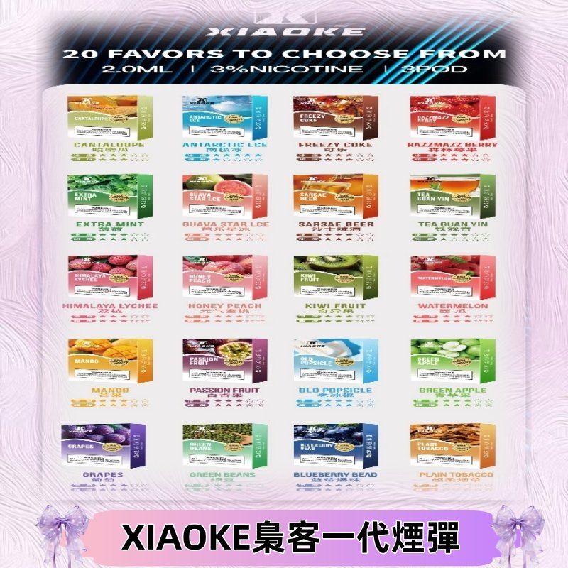 - 20種口味:從高涼度到低涼度不同涼度口味,XIAOKE梟客一代煙彈都能滿足到客戶不同的味蕾。